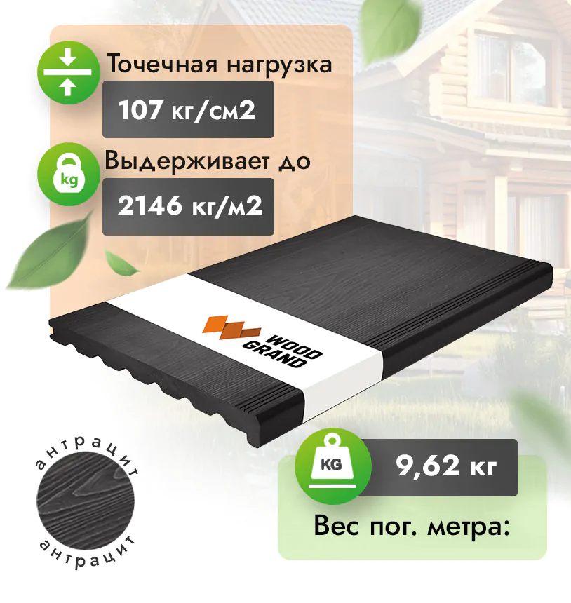 Наши ступени из ДПК выдерживают до 3318 кг/м2, влагостойкие, не требуют ухода.